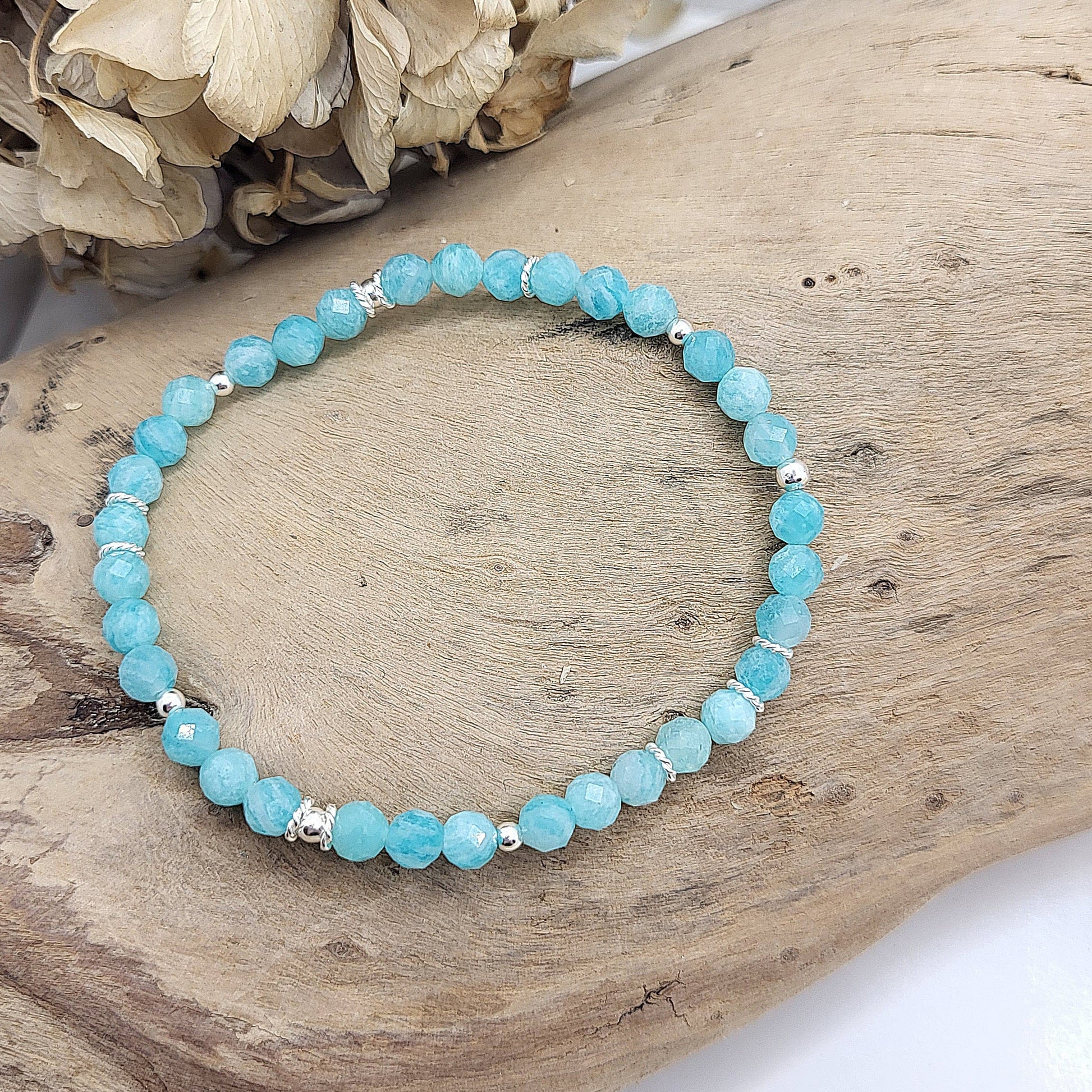 Dieses schöne elastische Armband haben wir aus facettierten Aamzonit Edelsteinen (5mm) und sehr vielen Zwischenstücken kreiert.