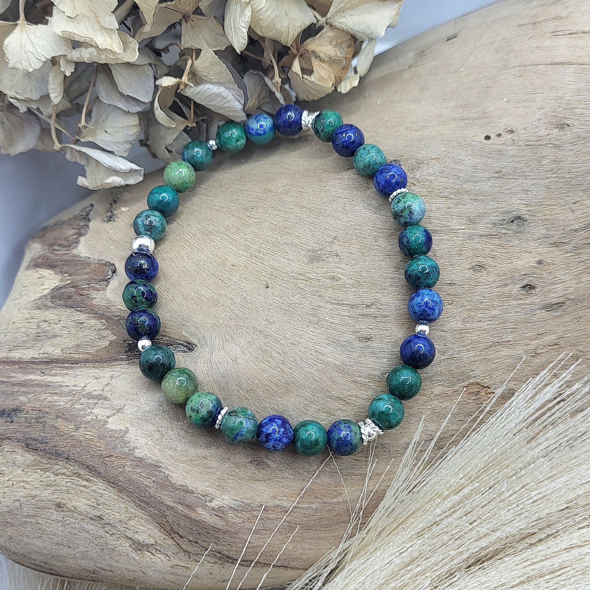 Dieses schöne elastische Armband haben wir aus Azurit Malachit Edelsteinen (6mm) und sehr vielen Zwischenstücken kreiert.