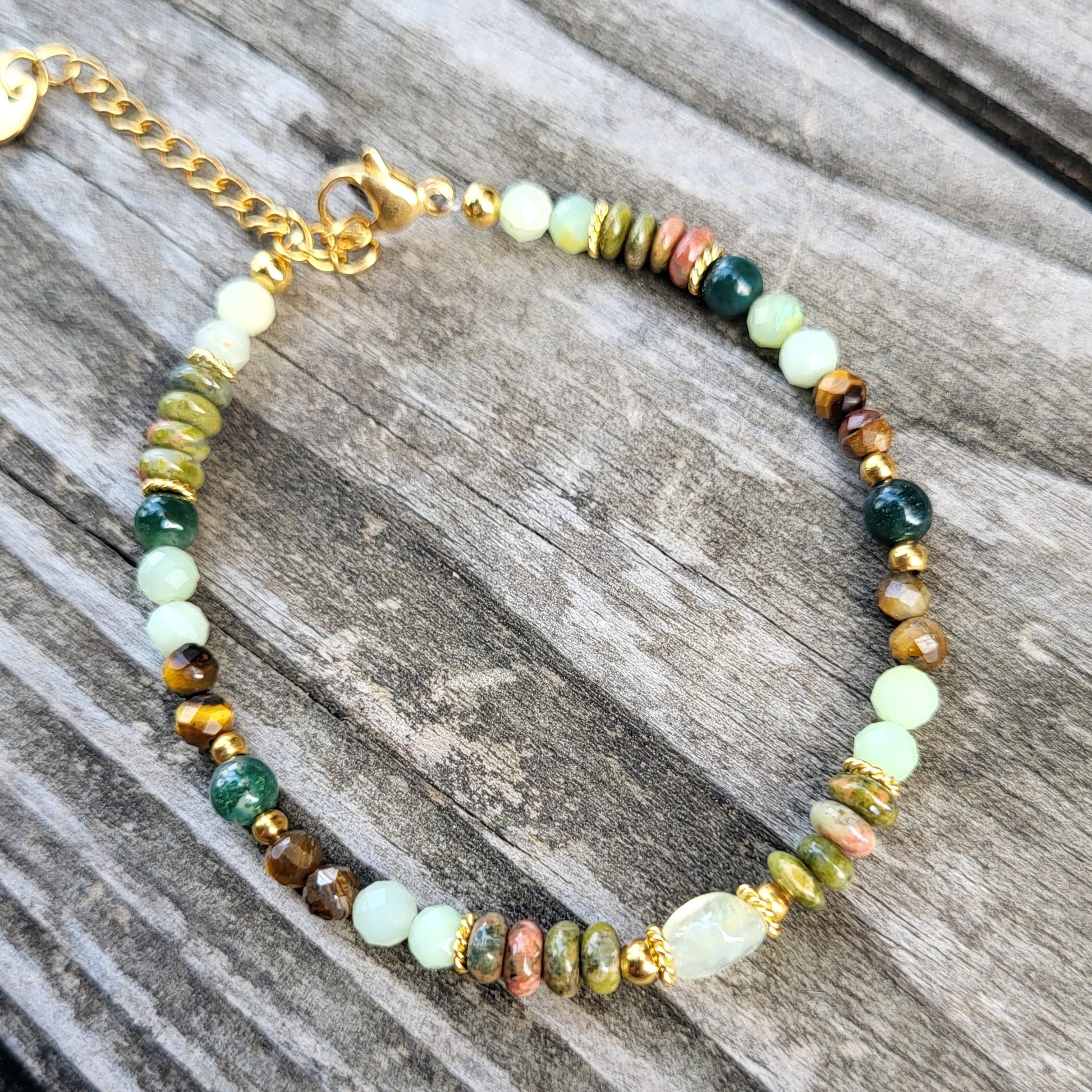 Das Armband haben wir aus Unakit, Prehnit, Tigerauge und Chrysopras Edelsteinen (4mm) und vielen Zwischenstücken aus vergoldetem Silber und Edelstahl kreiert. Das Armband ist auf Schmuckdraht aufgezogen und hat eine Verlängerungskette.