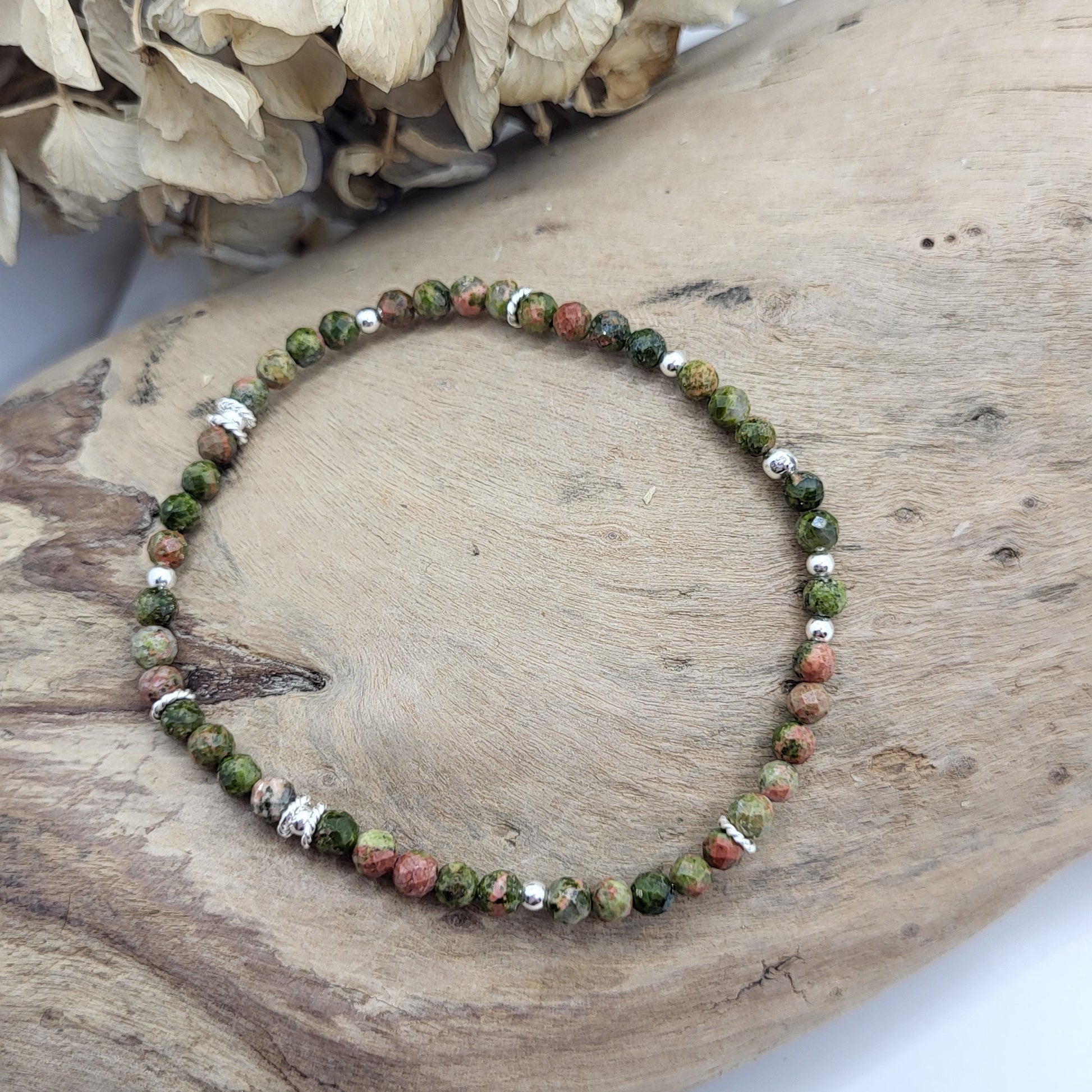 Dieses schöne elastische Armband haben wir aus Unakit Edelsteinen (3mm) und sehr vielen Zwischenstücken kreiert.