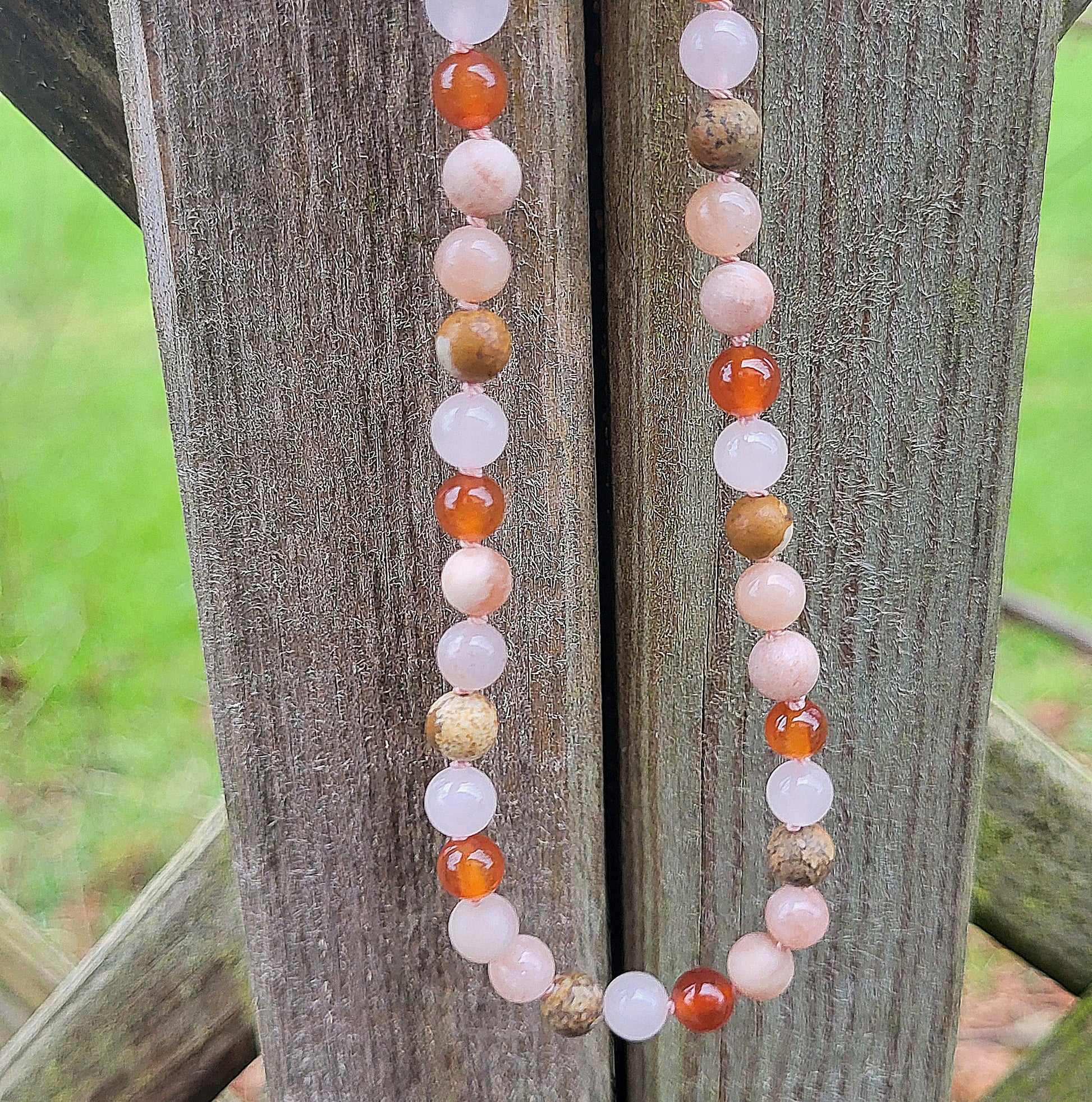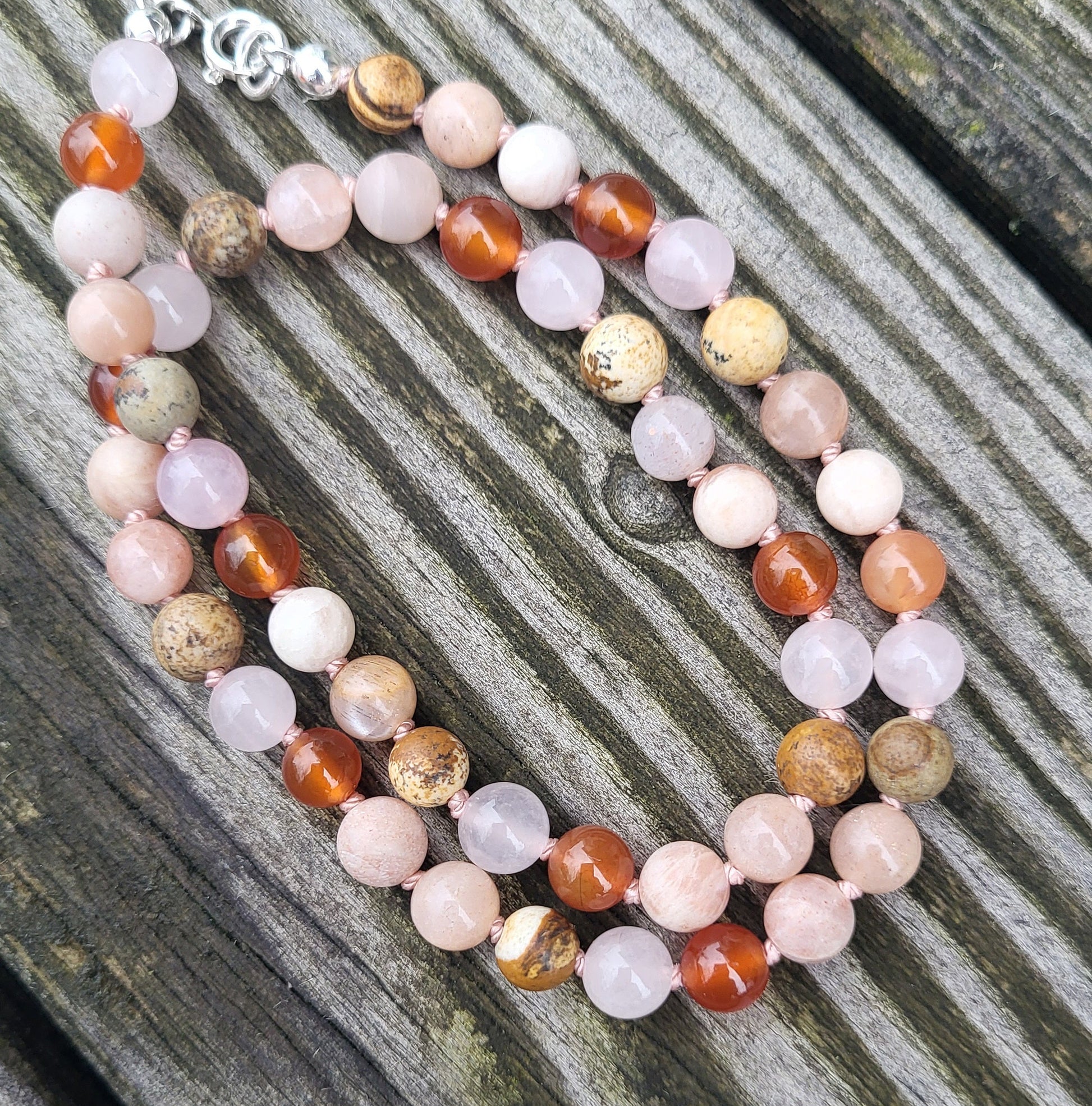 Diese schöne Kinderhalskette besteht aus Mondstein, Karneol, Rosenquarz, Jaspis und Sonnenstein Edelsteinen (6mm).