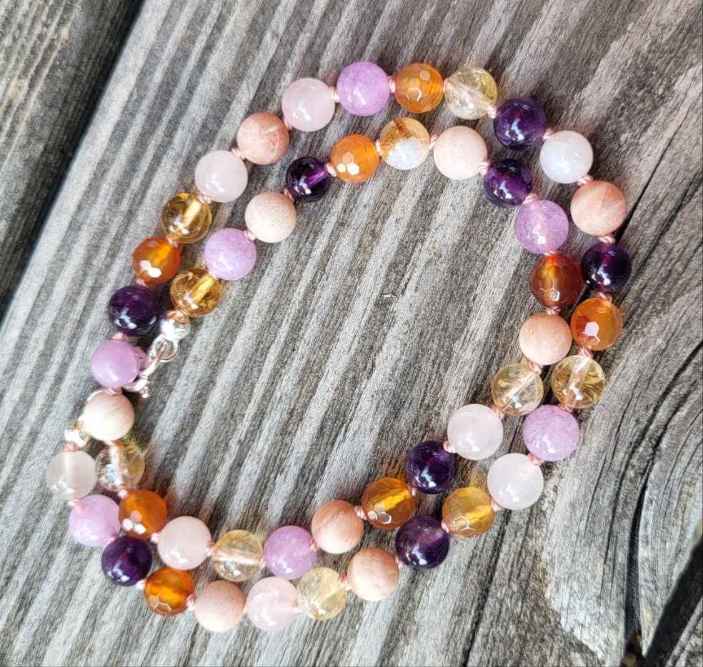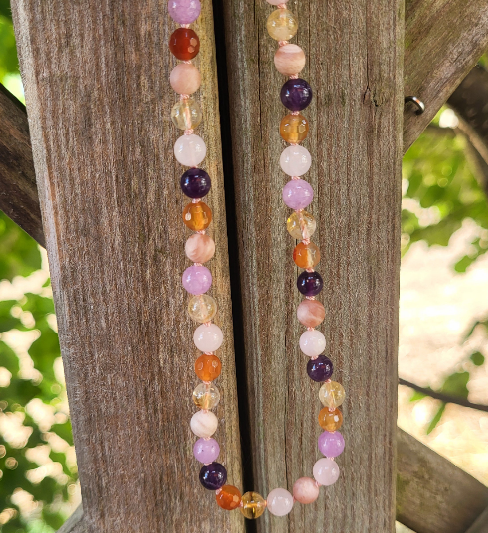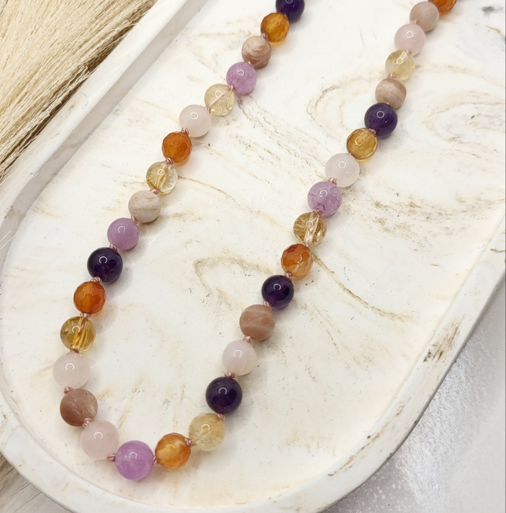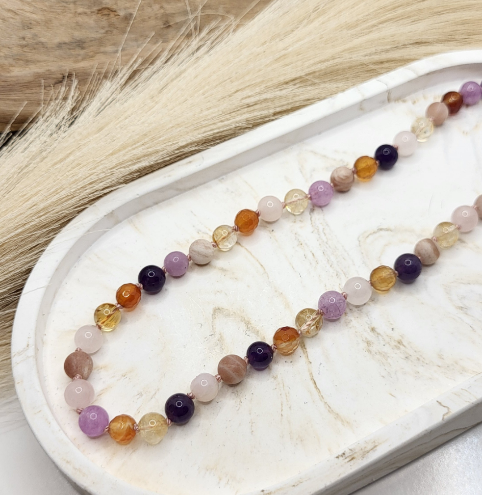 Die geknüpfte Halskette besteht aus 6mm Rosenquarz, Citrin, Amethyst, Mondstein und Karneol Edelsteinen. Die Kinderkette Liebe, Freude & Harmonie schenkt deinem Kind mit ihren bunten Edelsteinen Geborgenheit, Lebensfreude und innere Stärke.