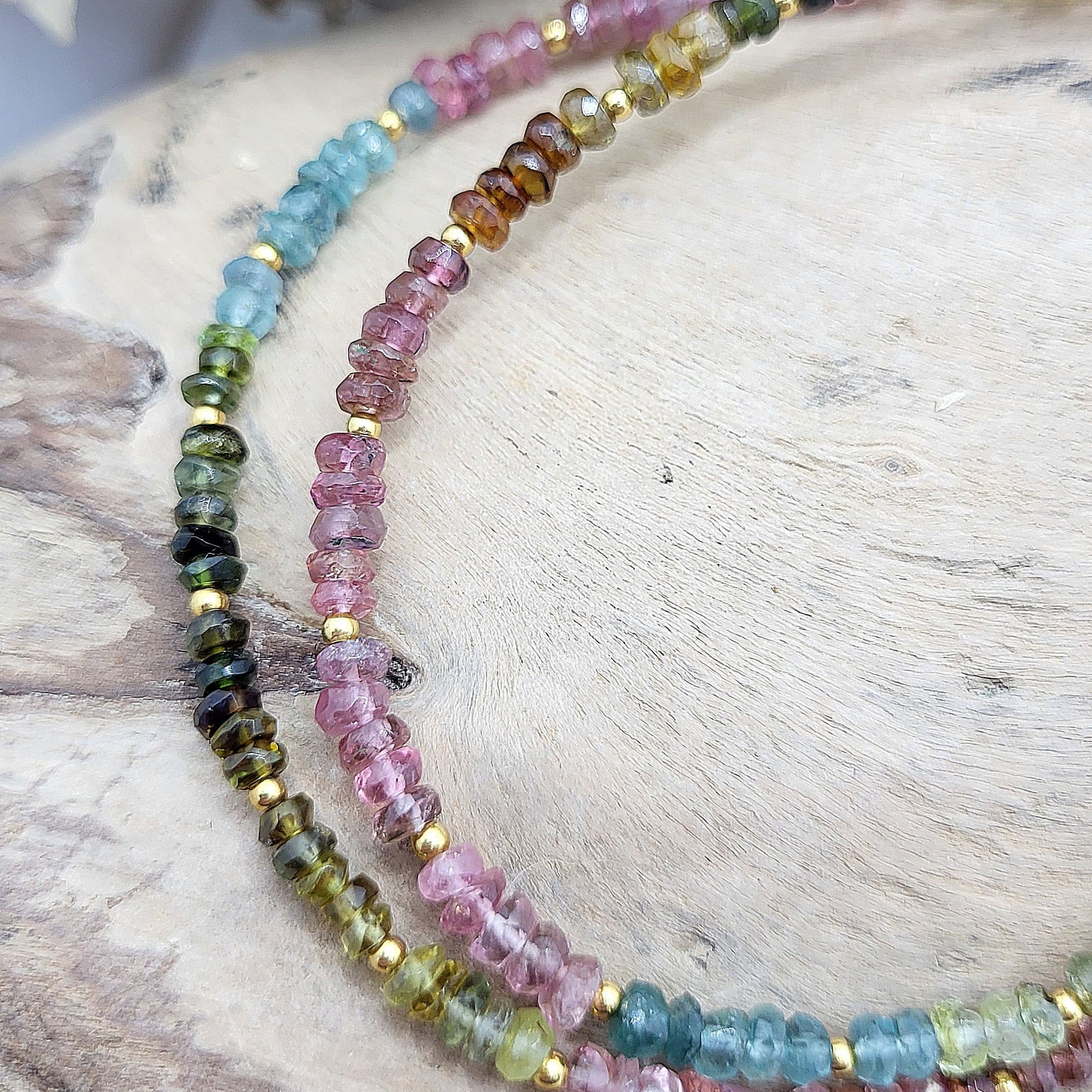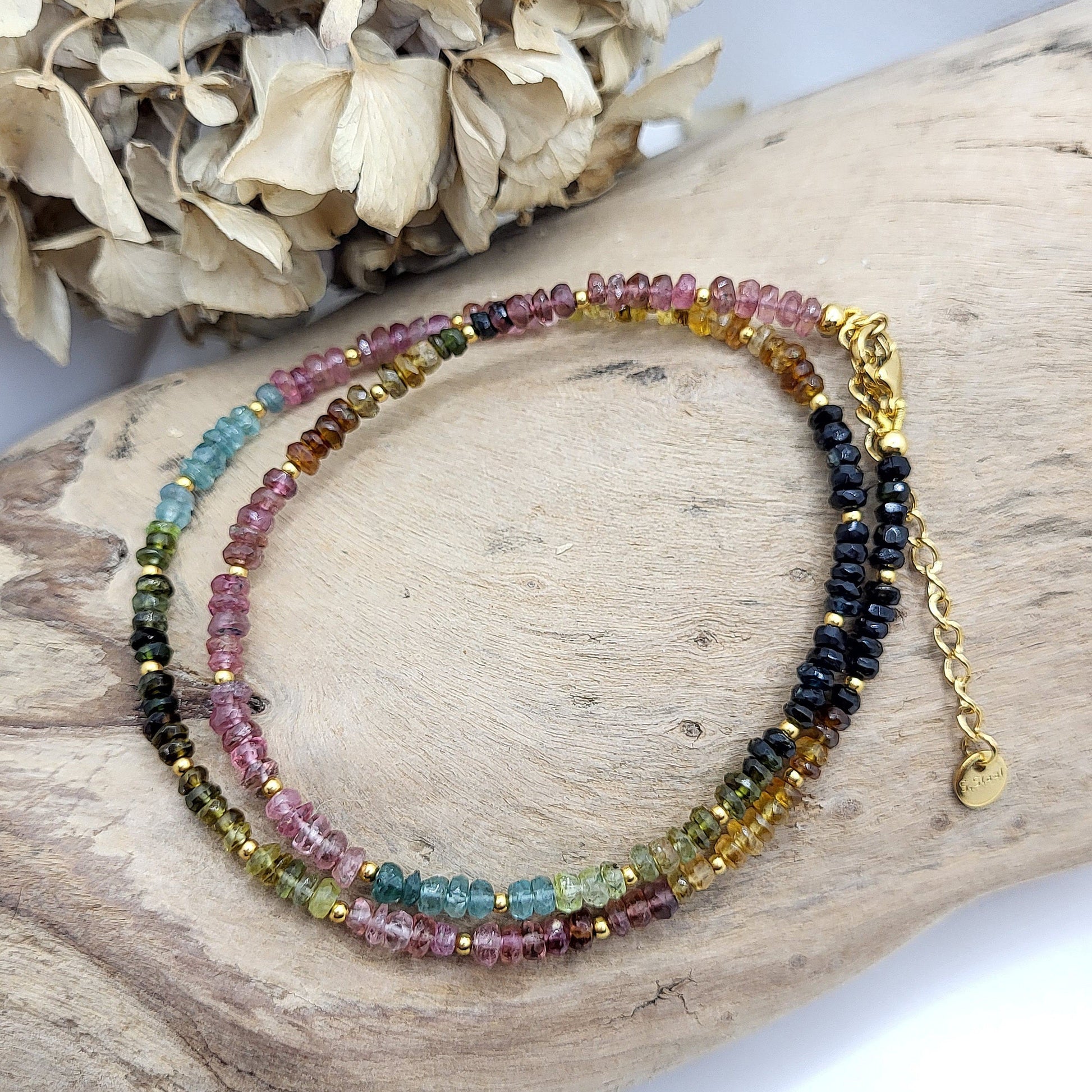 Die kurze Halskette besteht aus 3mm Turmalin Edelsteinen sowie 18k pvd vergoldete Edelstahl Zwischenteile.