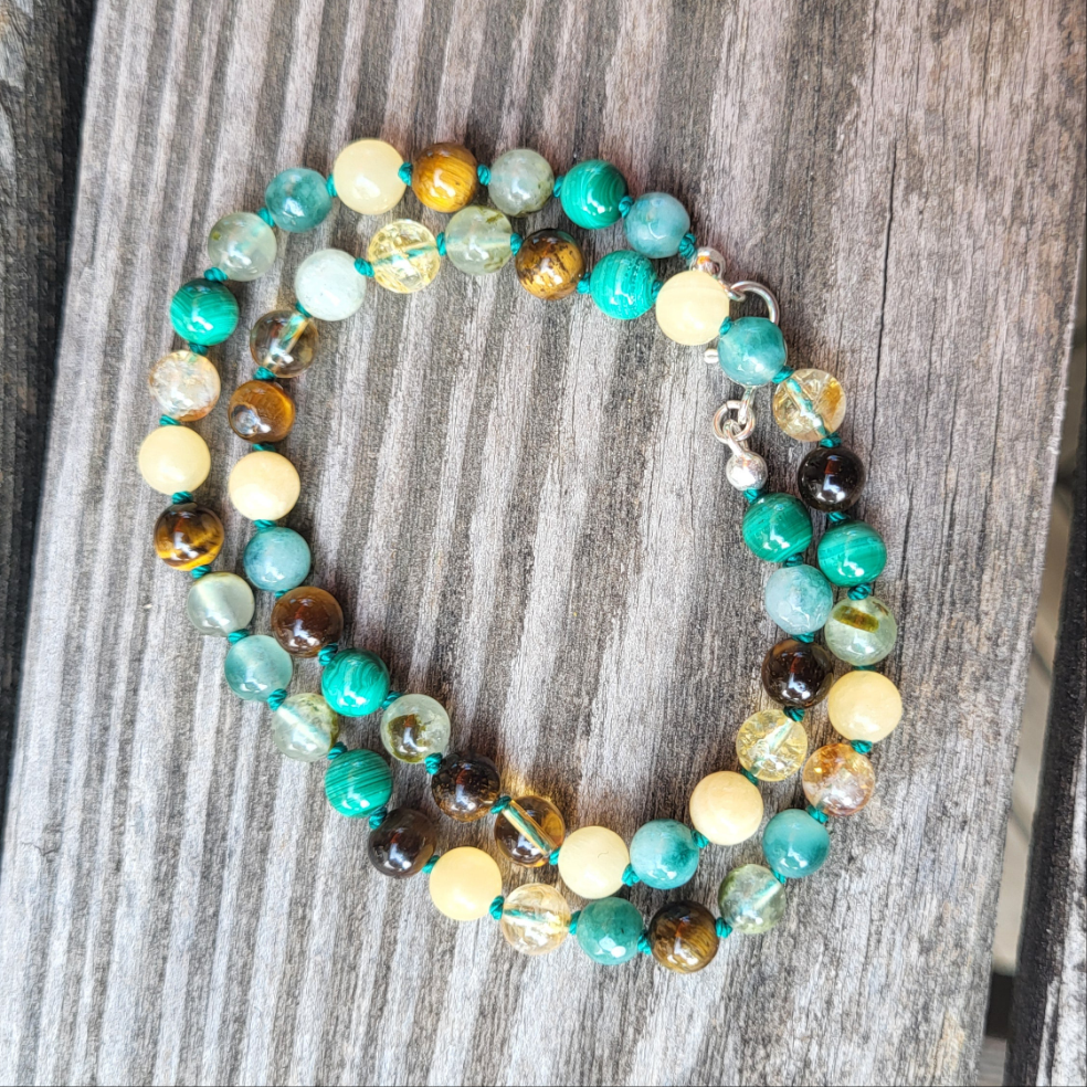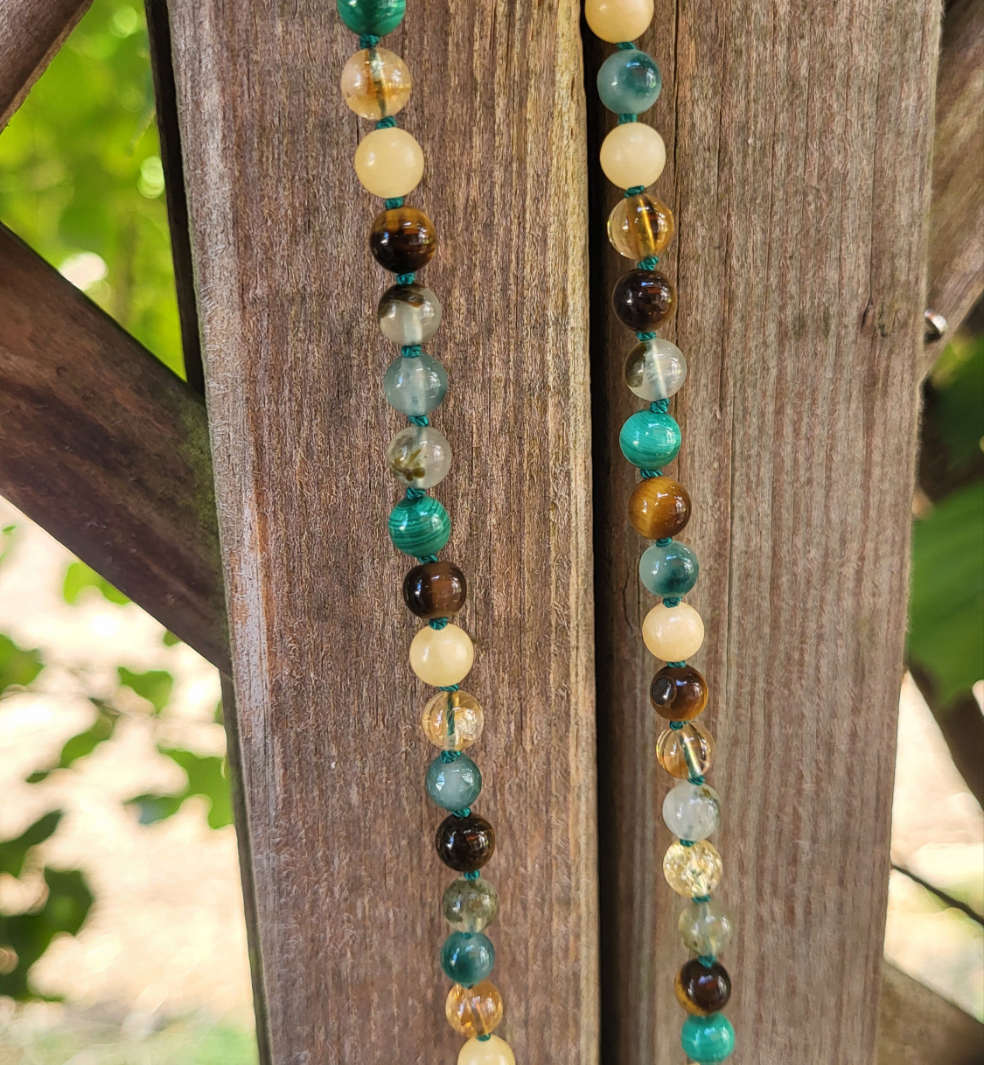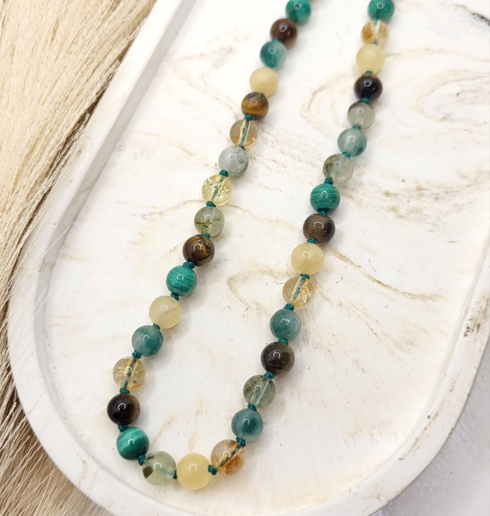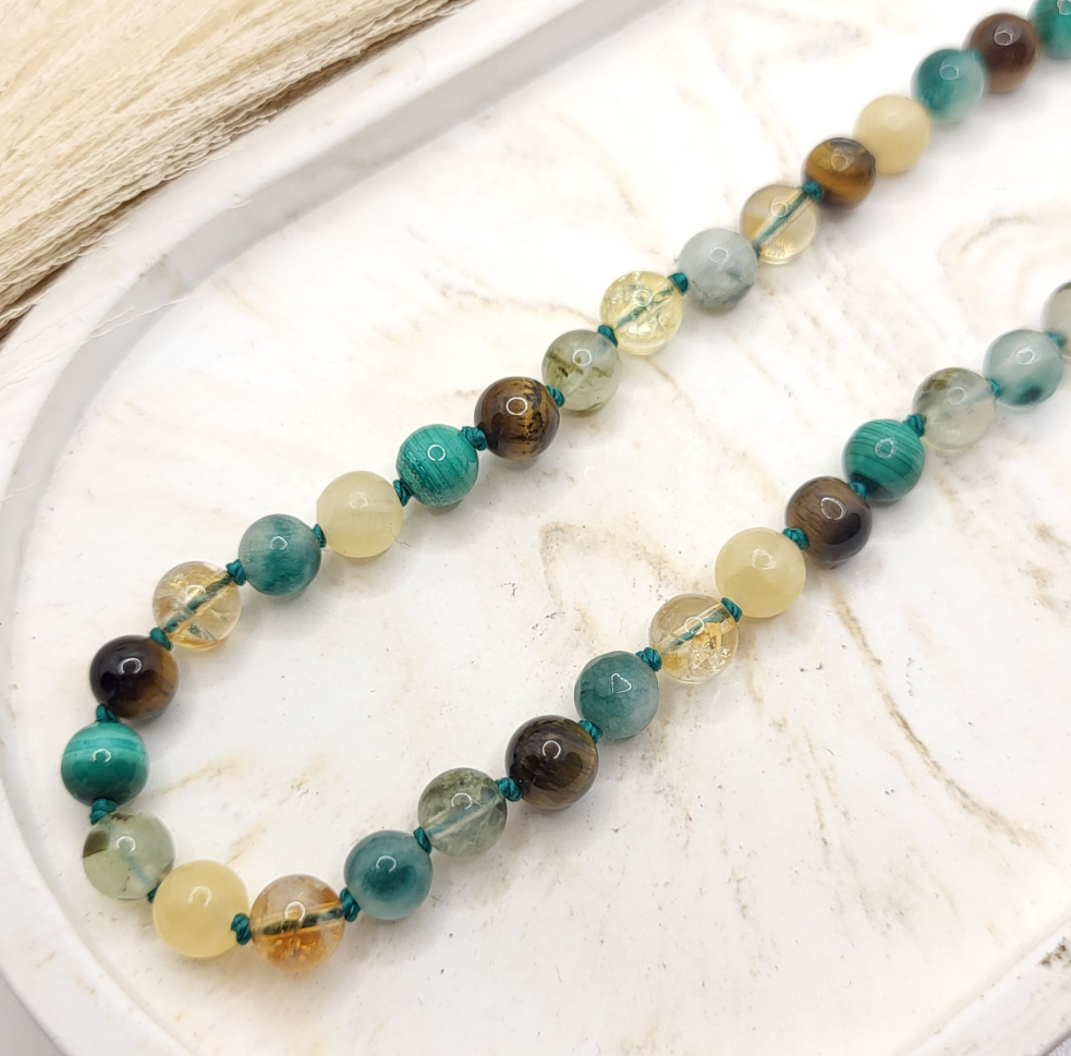 Die geknüpfte Halskette besteht aus 6mm Malachit, Tigerauge, Prehnit, Citrin, grüner Achat und gelber Jaspis Edelsteinen. Ein kleiner Begleiter für Zeiten der Veränderung – voller Stärke, Vertrauen und Lebensfreude