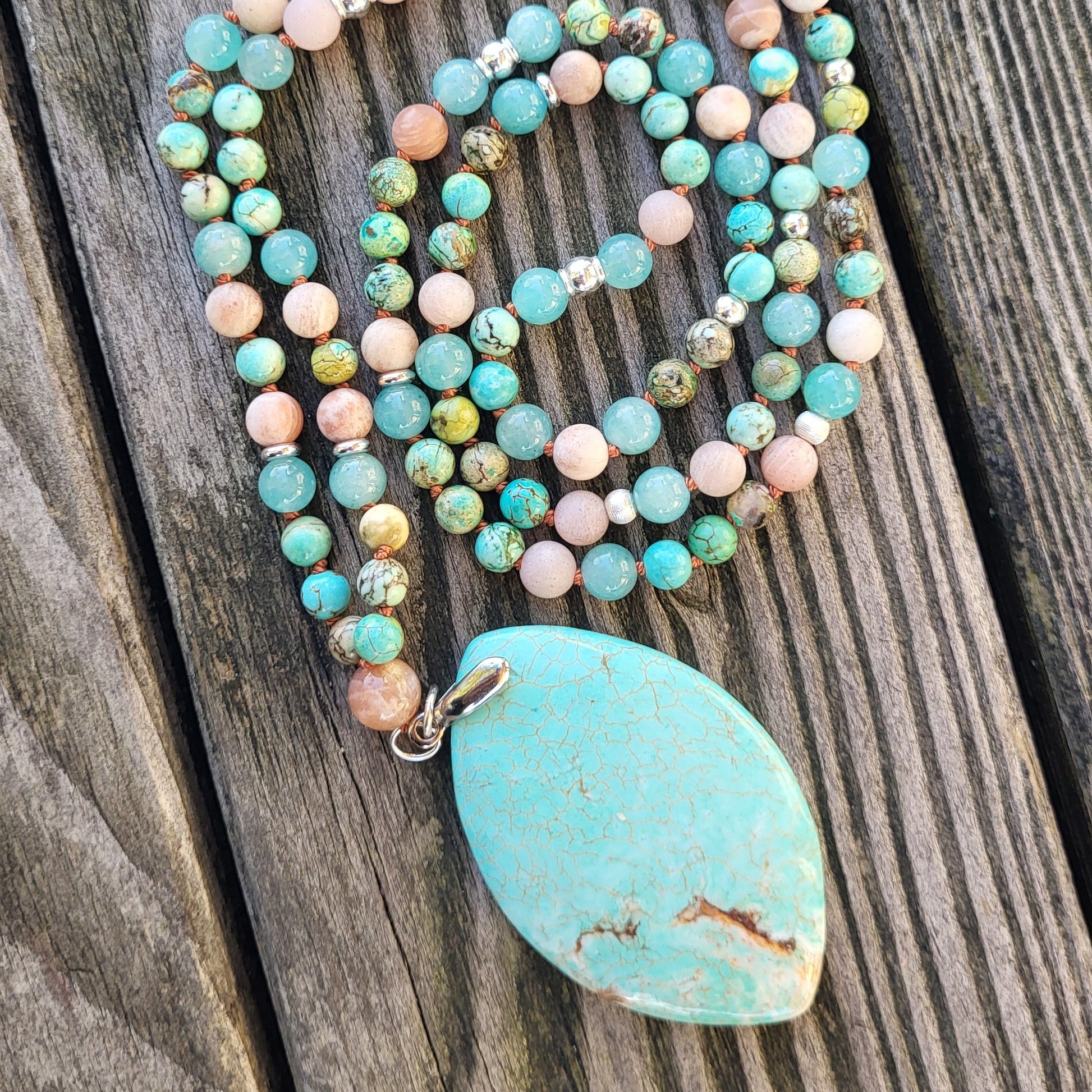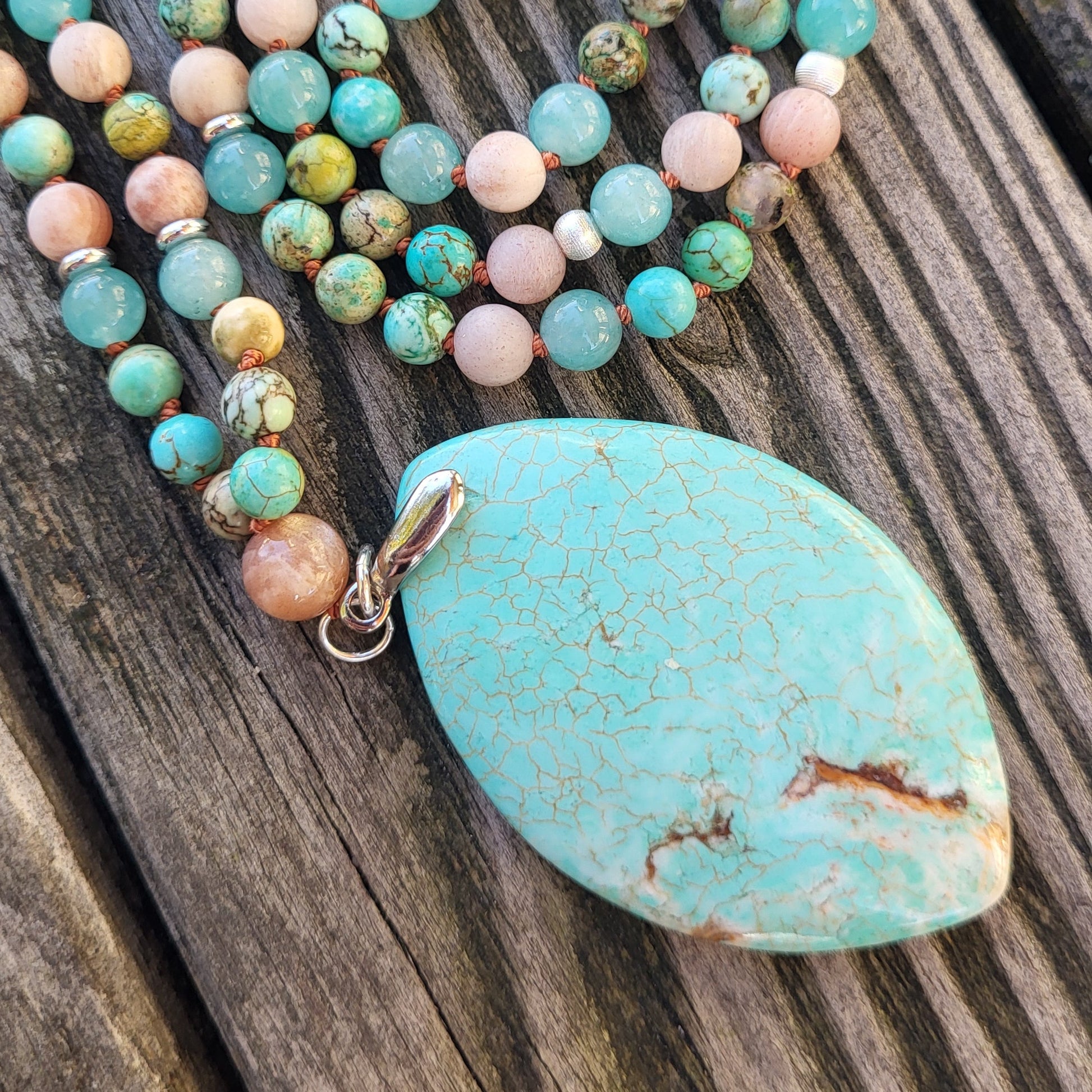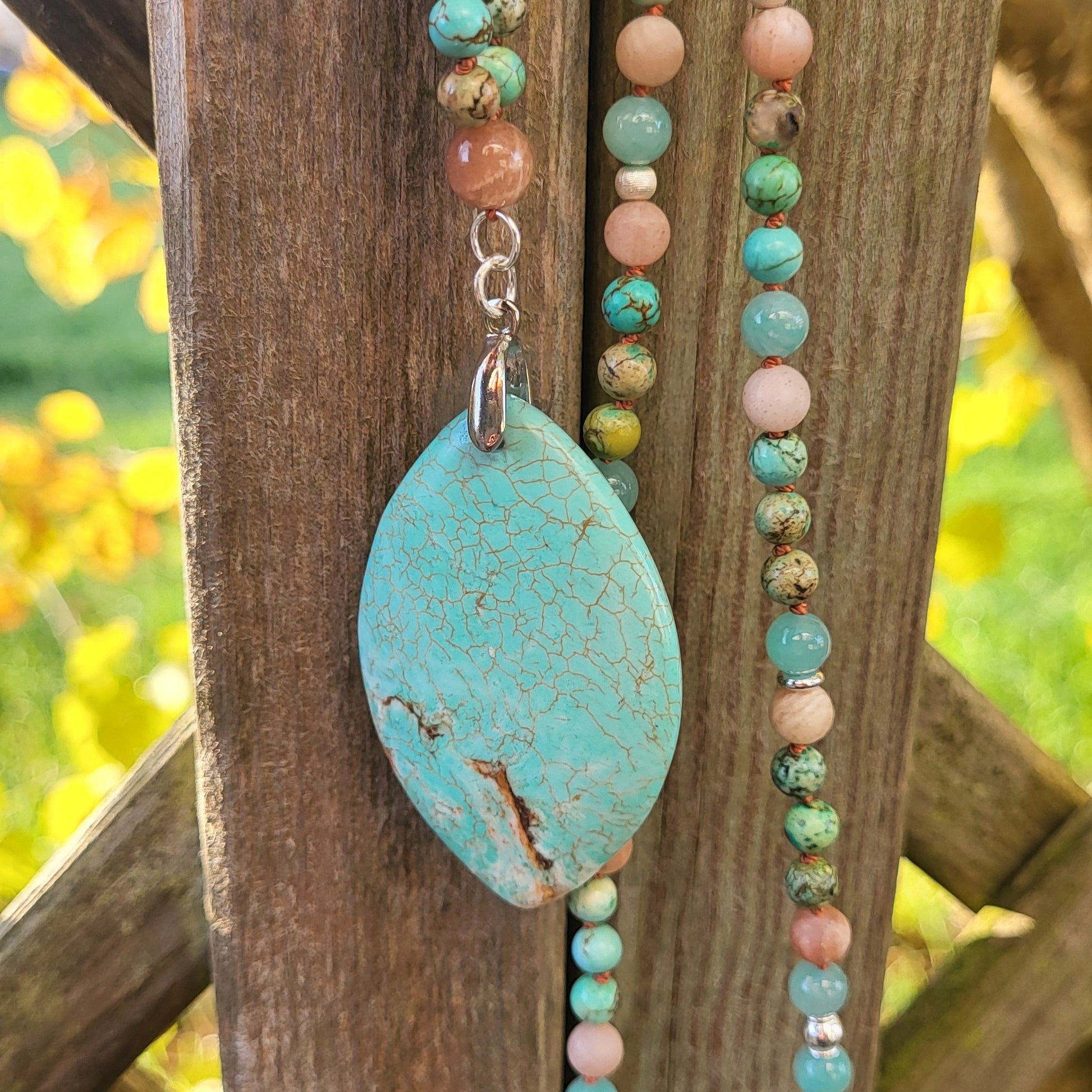 Die lange Halskette besteht aus 6mm türkis Howlith, Amazonit und Mondstein Edelsteinen sowie Zwischenteile aus 925 Silber. Der Anhänger besteht aus einem Jaspis Stein und ist ein absoluter Hingucker an der Halskette.