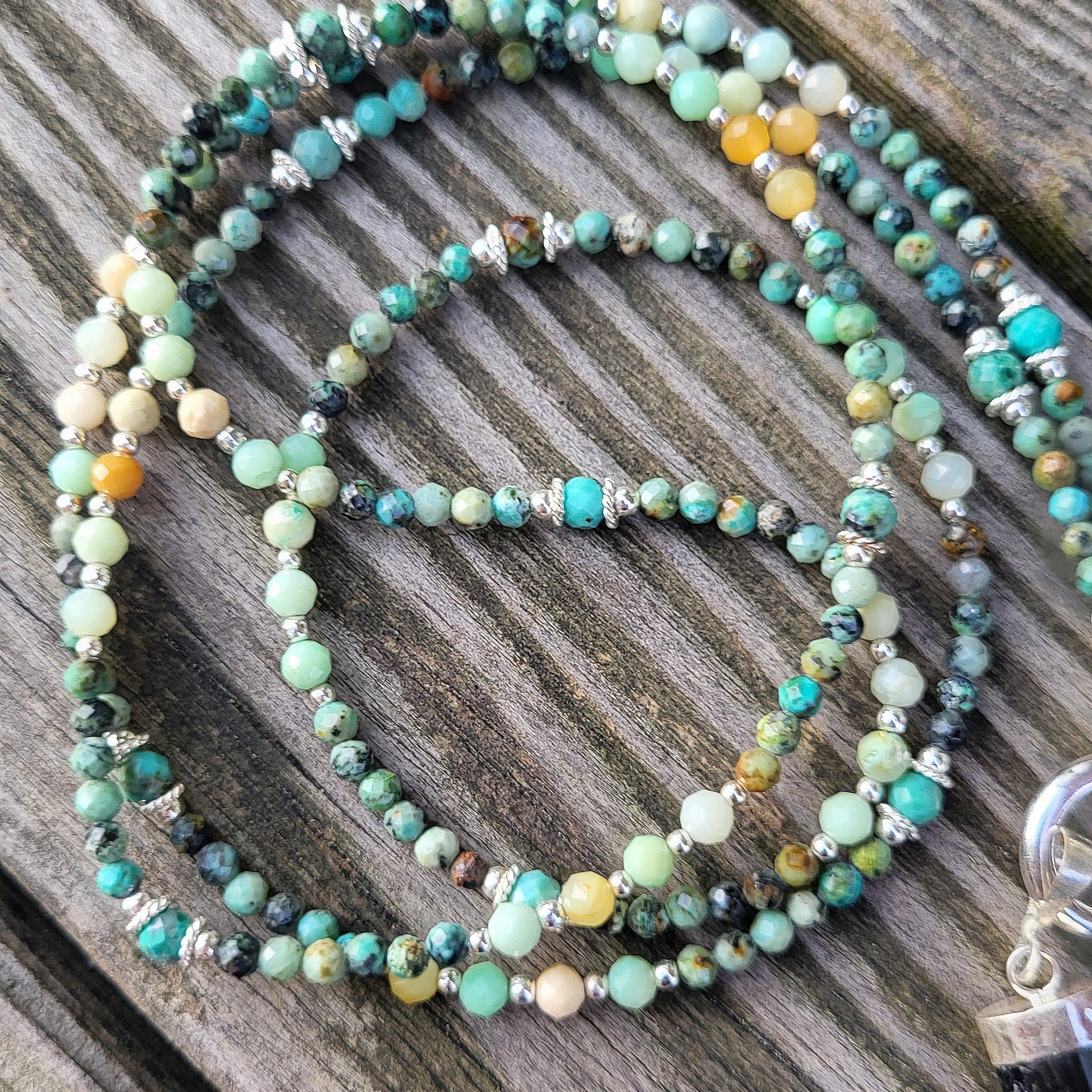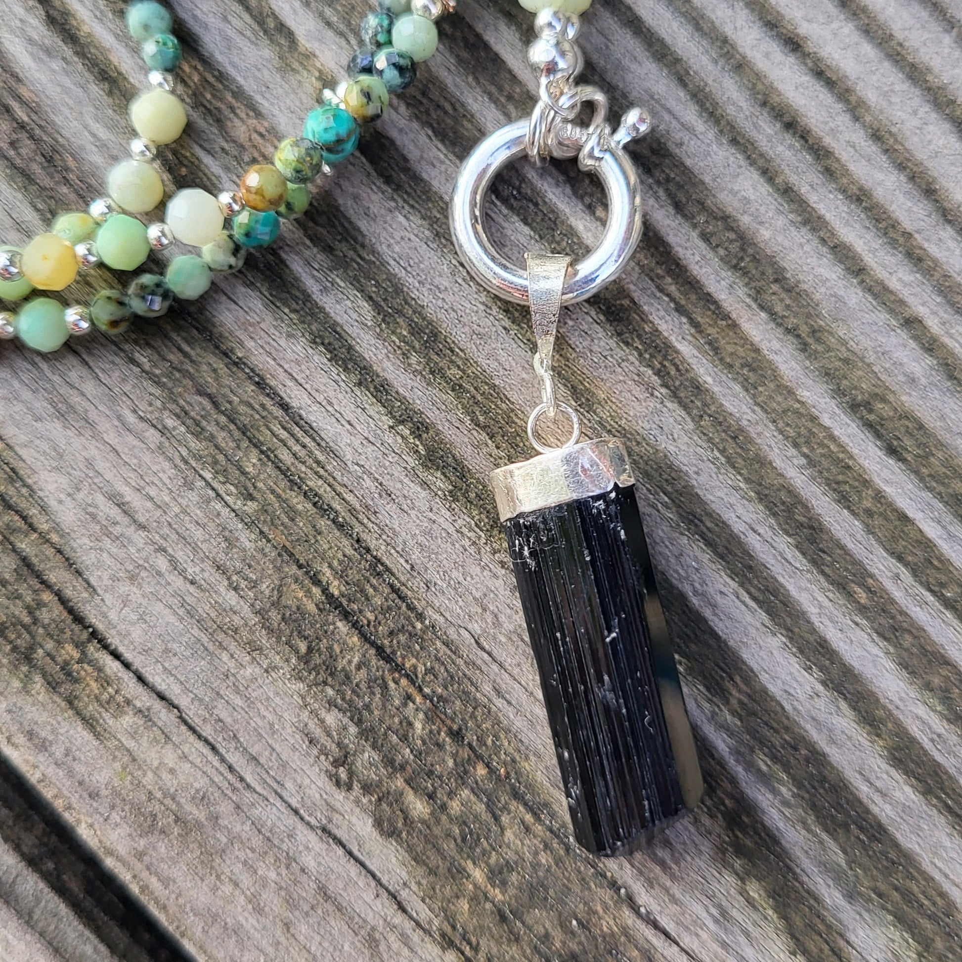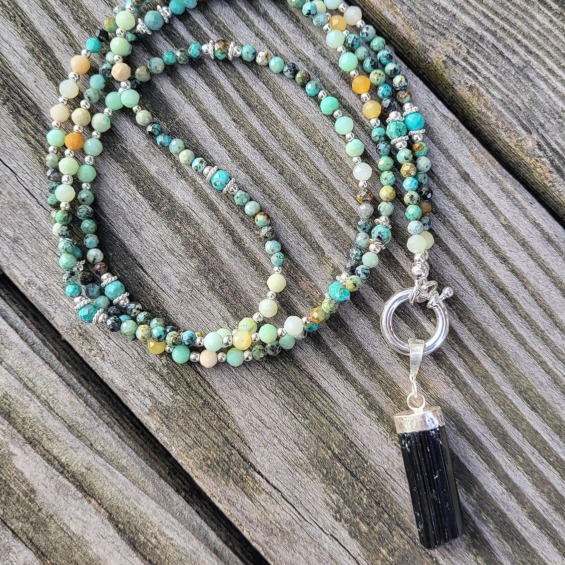 Die lange Halskette besteht aus 4mm Türkis und Chrysopras Edelsteinen sowie Zwischenteile aus 925 Silber. Die Steine wurden auf Schmuckdraht aufgezogen. Der Anhänger besteht aus einem Turmalin